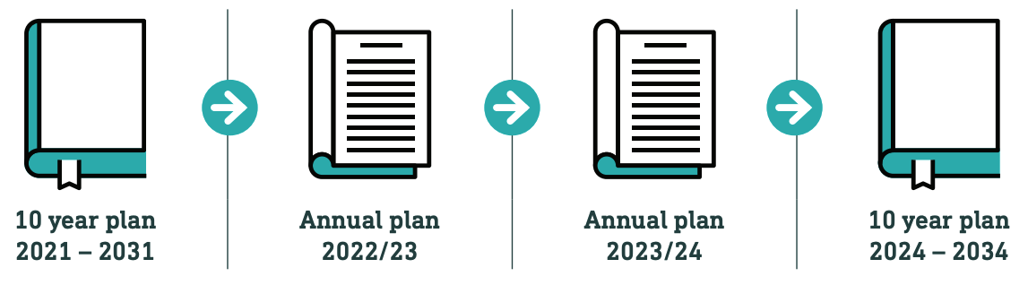 Below is an example infographic, taken from Dunedin City Council's 10 year plan 2021-31, showing the local government planning timeline: